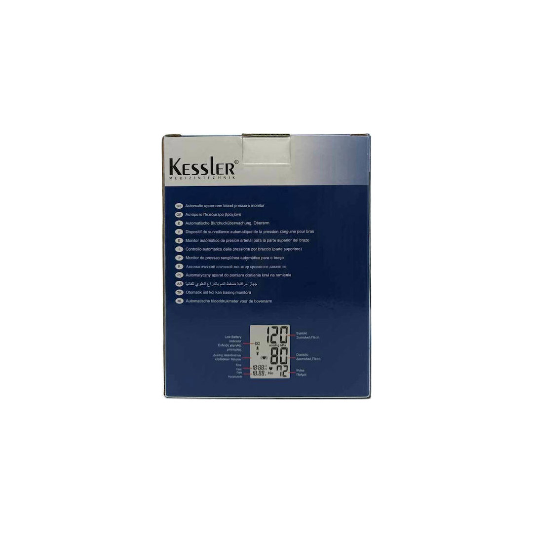 KESSLER PRESSURE LOGIC PORTABLE KS 520 Αυτόματο πιεσόμετρο βραχίονα. Αυτόματο πιεσόμετρο βραχίονα με δείκτη κατάταξης της πίεσης του αίματος, 120 αυτόματες μνήμες και με υποδοχή για μετασχηματιστή ρεύματος. Περιέχει δείκτη μη κανονικού χτύπου καρδιάς, ενδείξεις ημερομηνίας και ώρας και μέσο όρο των τελευταίων 3 μετρήσεων. Έχει οθόνη με μεγάλες ενδείξεις για εύκολη χρήση. Περιλαμβάνονται 4 αλκαλικές μπαταρίες μεγάλης διάρκειας Κλινικώς δοκιμασμένο, με εγγύηση κατασκευαστή 5 ετών. Ψηφιακό Πιεσόμετρο Μπράτσου που μετράει τη συστολική πίεση (SYS), τη διαστολική πίεση (DIA) και τους παλμούς της καρδιάς.