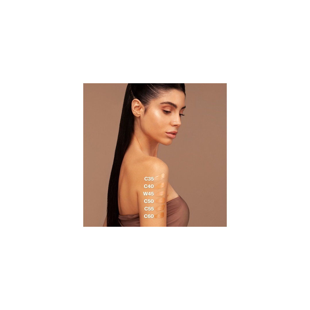 Διατίθεται σε 18 αποχρώσεις: 6 “Fair”, 6 “Medium” και 6 “Tan-Dark” αποχρώσεις, διαχωρισμένες σε ζεστούς (C) και ψυχρούς (W) υποτόνους. Φυσική κάλυψη. “Second-skin” εφέ. Υψηλή συγκέντρωση νερού για βαθιά ενυδατωμένο δέρμα. Οικοδομήσιμη υφή.